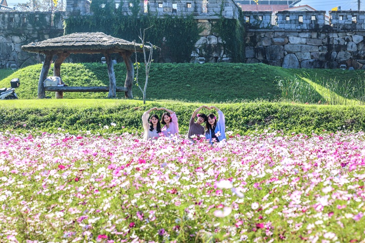 청도읍성 인근에 가을의 낭만을 더하는 코스모스꽃밭이 활짝 피어 관광객들의 발길을 사로잡고 있다.
